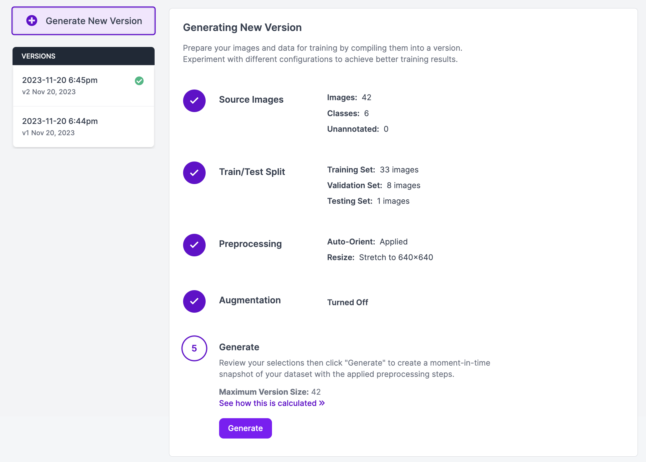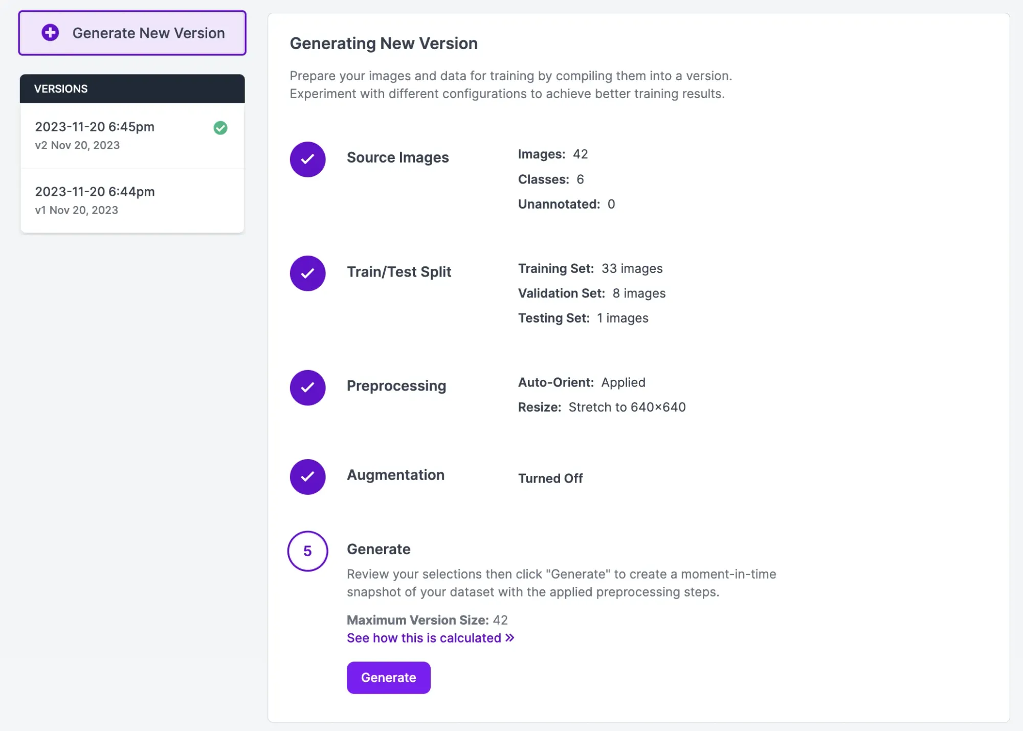 Once you are ready to train a model, click “Generate” in the Roboflow sidebar. At this stage, you can choose augmentation and preprocessing steps to apply to your dataset. For your first model version, we recommend leaving the default augmentation and preprocessing steps.