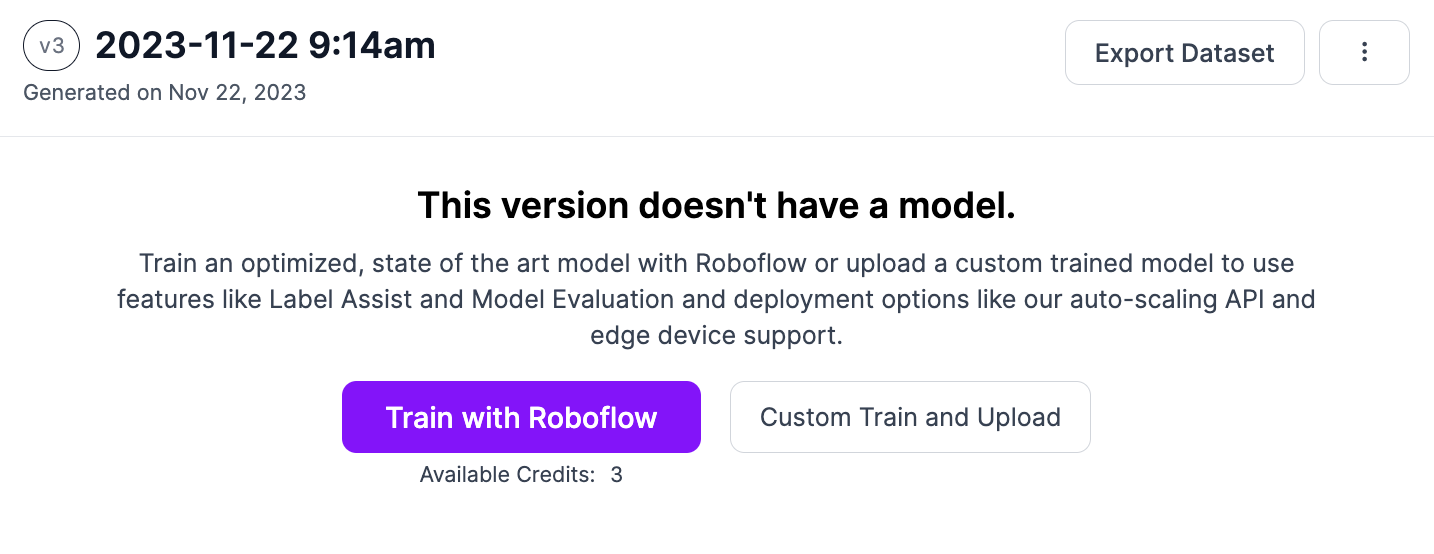 Click “Generate” at the bottom of the page to generate a dataset version. A checkpoint with all your image data will be created. Click “Train with Roboflow” and follow the on-screen instructions to train an object detection model: