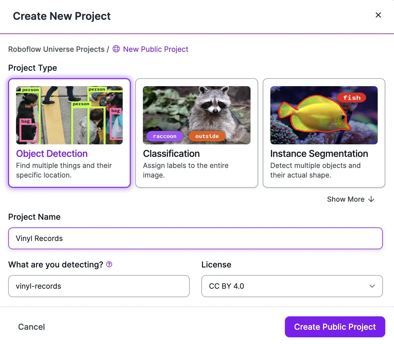 Create a new object detection project in the Roboflow dashboard: