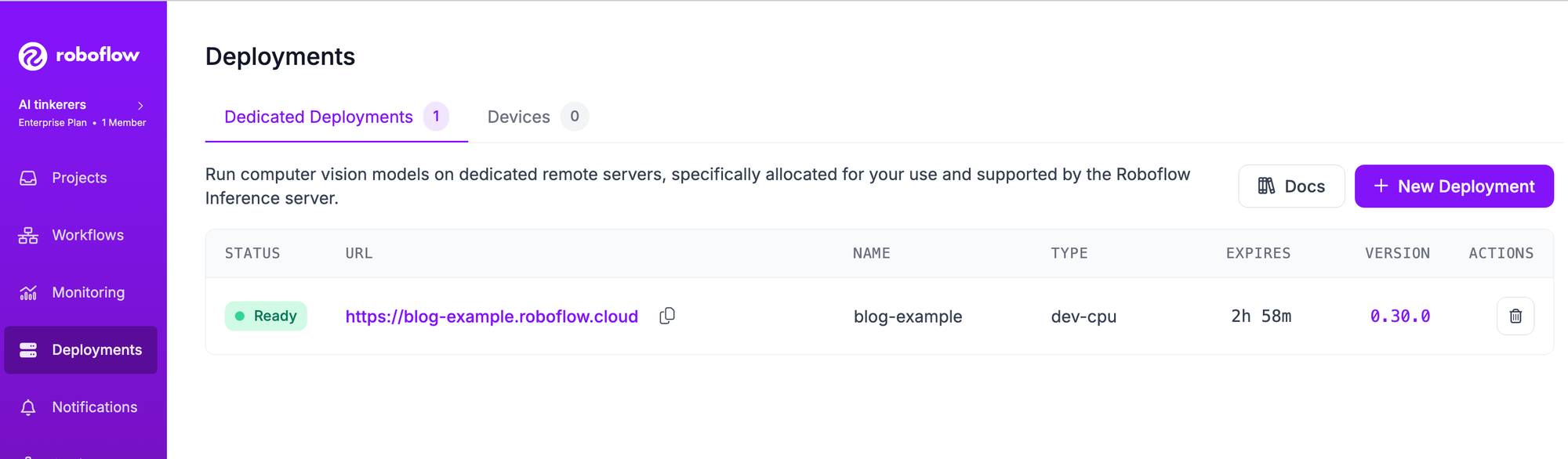 Roboflow's Dedicated Deployments offer a flexible, secure, and scalable solution for deploying computer vision models. Whether you're in the development phase or ready for production, the service provides the infrastructure needed to focus on what matters most: building powerful computer vision applications.
