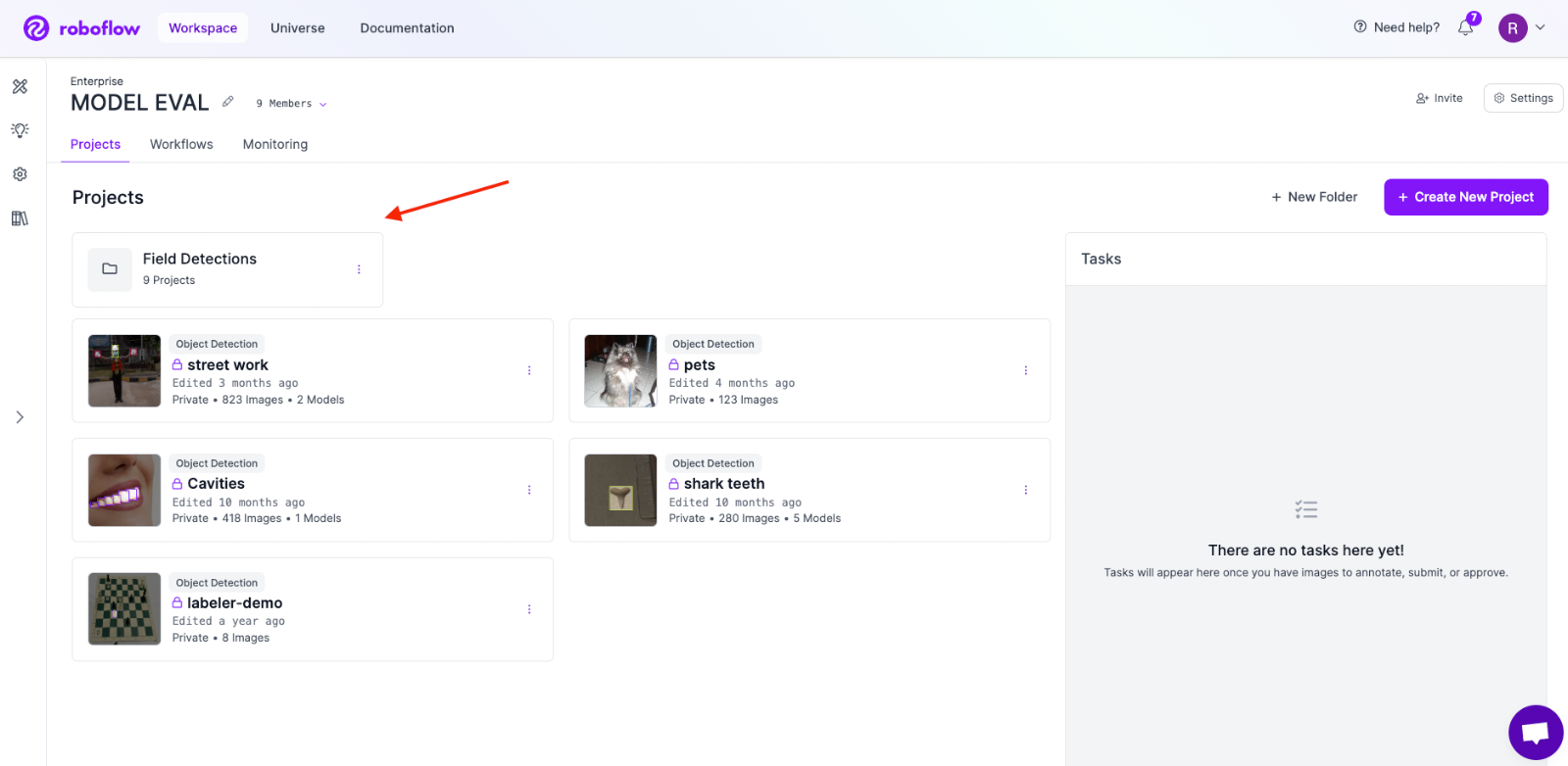 Project Folders will appear at the top of your workspace. You can create and manage your folders using the Dashboard or by using Roboflow’s API.