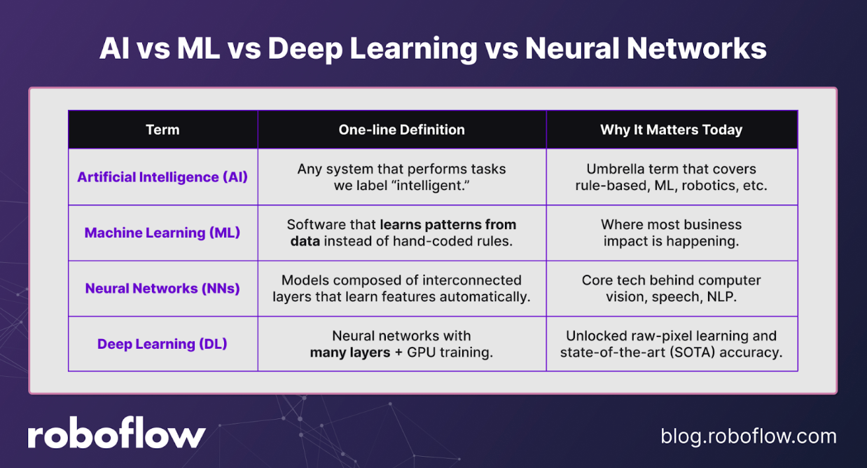 Artificial Intelligence (AI) is the umbrella term for systems that perform tasks we call “intelligent.” Machine learning (ML) is a subset of AI, which is any software that learns rules from data rather than using hand-coded logic.
