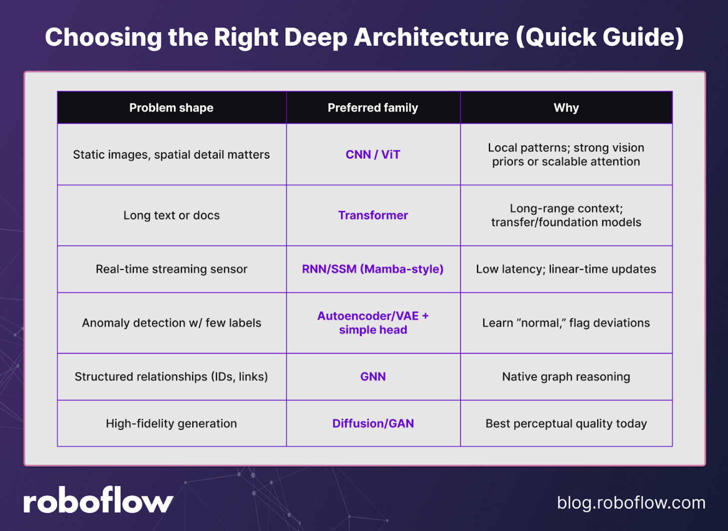 With that mental model, the next question is which deep architecture fits your problem and constraints. The sections below summarize the most common families, why they work, and where they shine.