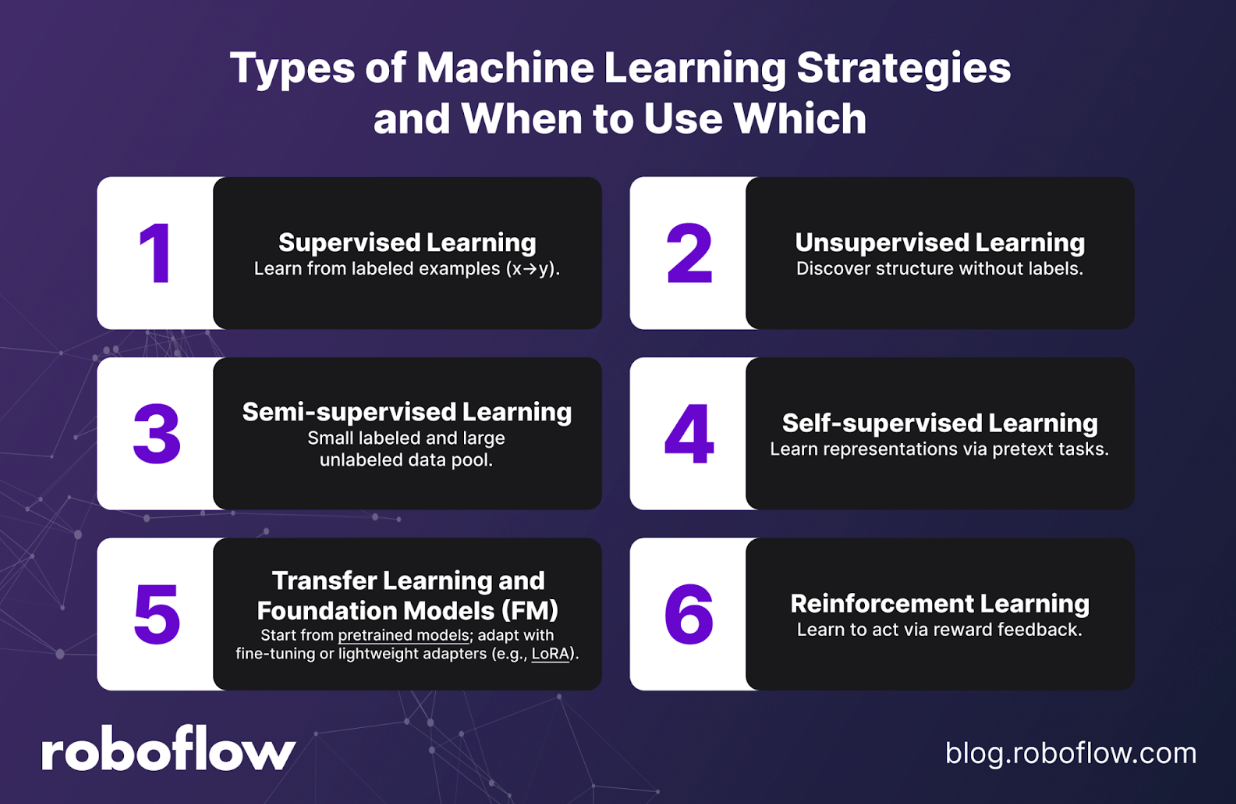 Different problems call for applying varying types of machine learning strategies. Choosing an approach that aligns with your data availability, budget, and timeline is important. Here are relevant types of ML strategies to consider.