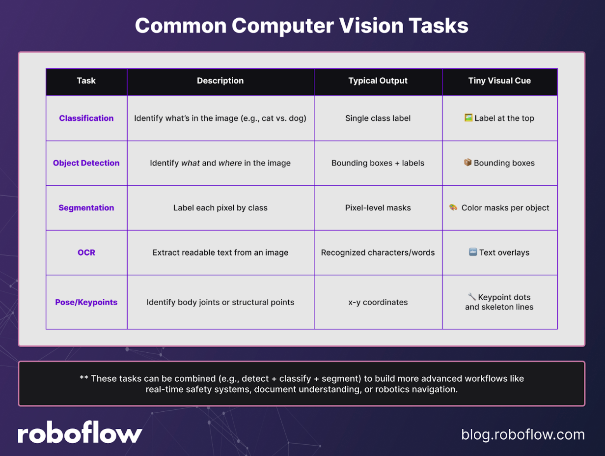 You can combine these tasks (e.g., detect + classify + segment) to build more advanced workflows like real-time safety systems, document understanding, or robotics navigation.