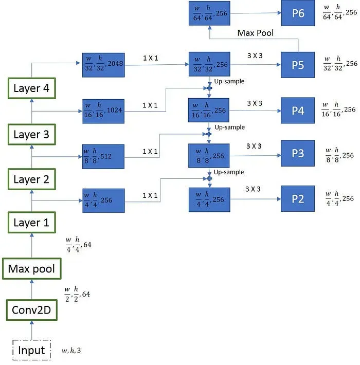 - Feature Fusion: FPN creates connections between different levels of the backbone network to create a top-down pathway. This top-down pathway combines high-level semantic information with lower-level feature maps, allowing the model to reuse features at different scales.
