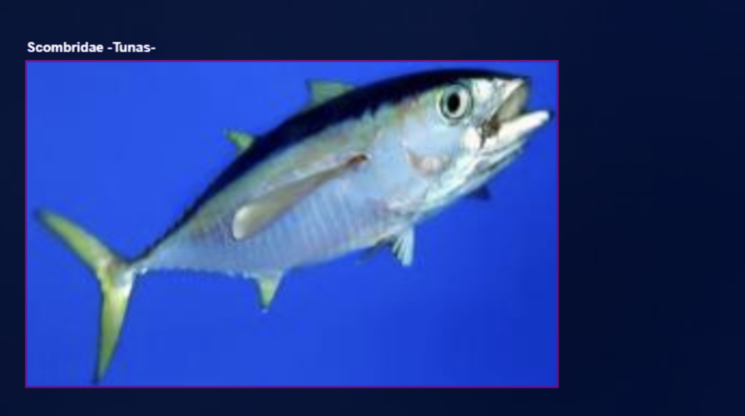 To identify fish species, we are going to train a computer vision model that can find the location of fish in an image. This is done by collecting images of fish, then labeling each fish with a bounding box or polygon tool that encloses the fish. The species is assigned as the class label for that bounding box or polygon. Following is an example of using a bounding box to label fish species from Roboflow Fish Dataset.