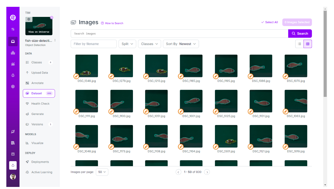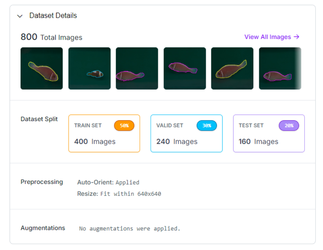 Preparing a dataset is a crucial step in building any computer vision model. For this project I use Measure the size of the fish computer vision project dataset from Roboflow Universe. I have downloaded the dataset images and created my own object detection project (named fish-size-detection) and uploaded all images to this project workspace.