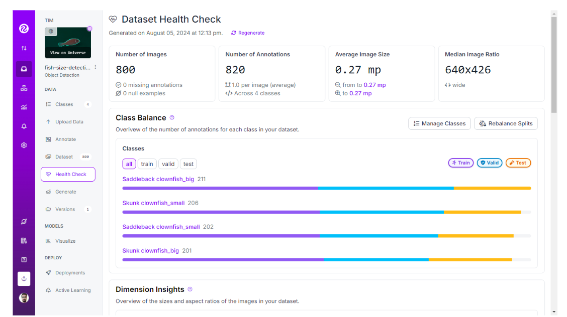 You can use the Roboflow dataset health check option to assess and improve the quality of your dataset. It offers a range of statistics about the dataset associated with a project.