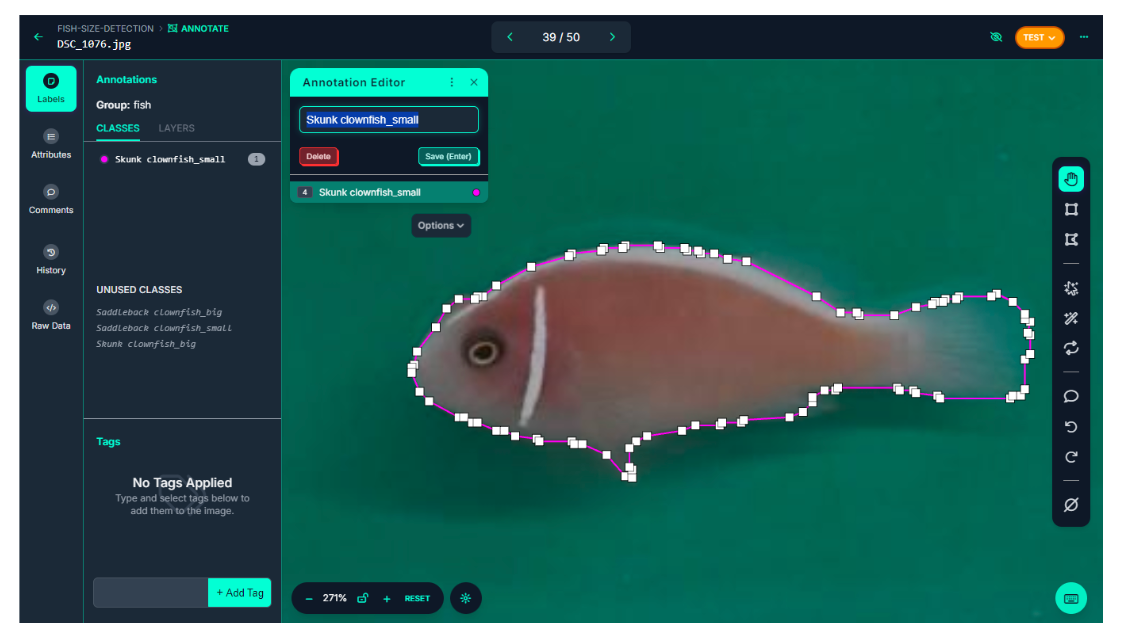 In our project, we will use the Roboflow polygon tool to annotate fish in the image (see figure below) for training object detection models.