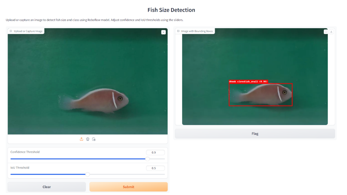 iface.launch()This Python script creates a Gradio app that allows users to upload or capture an image and detect fish sizes using a pre-trained model from Roboflow.