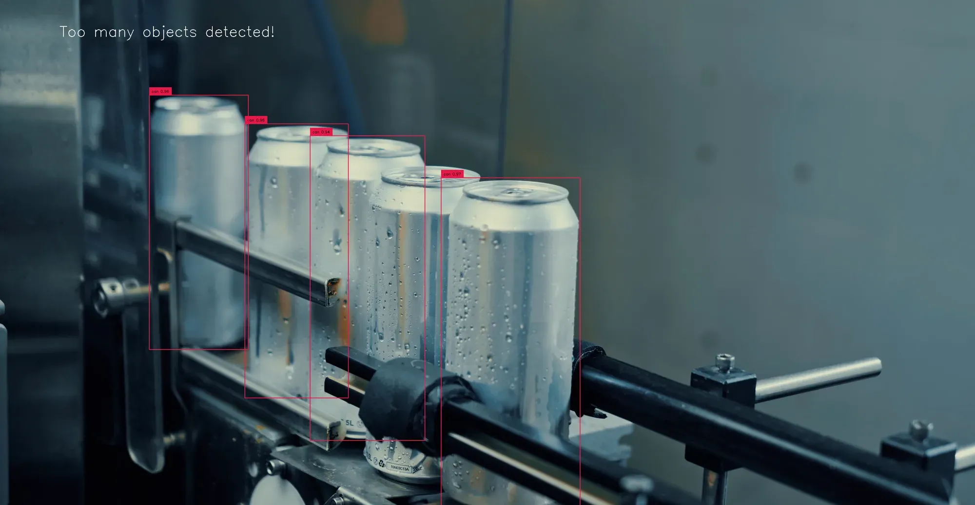 Suppose we want to know when there are too many aluminum cans visible in view. This is indicative of there being a blockage somewhere downstream that is causing an issue with cans flowing through the assembly line. With computer vision, we can write logic to record when too many objects are visible in a camera view.