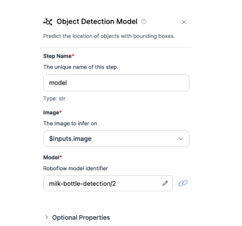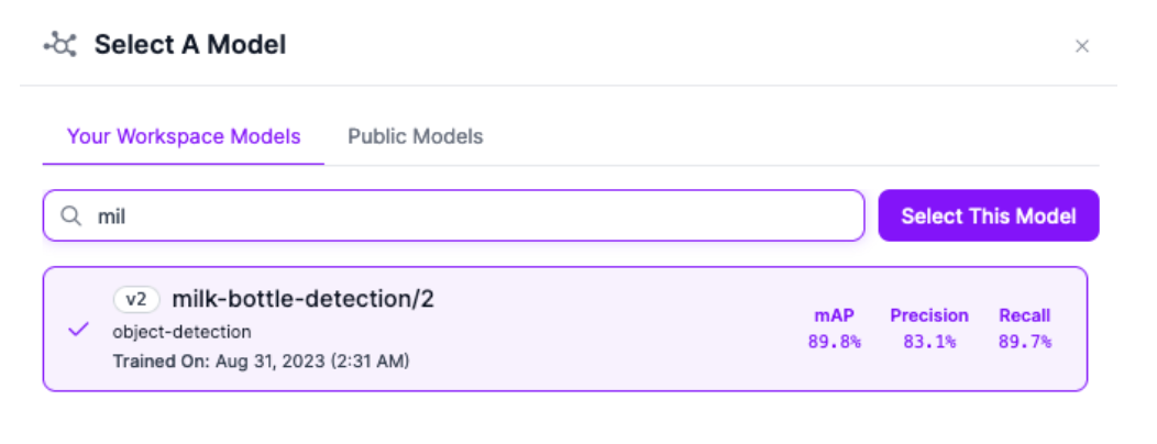 For this guide, we are using a milk bottle detection model. This model has been trained to identify milk bottles and bottle tops. You can use any model with the Workflow, however.