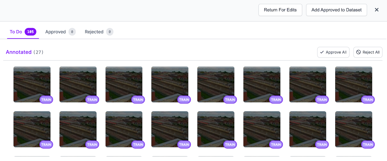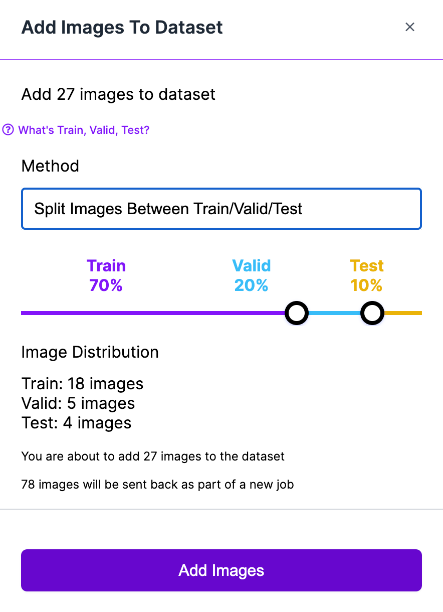 When you have annotated all images, click the "Add Approved to Dataset" button to choose a train, test, and valid split. We recommend a 70-15-15 split between your training set, test set, and validation set.