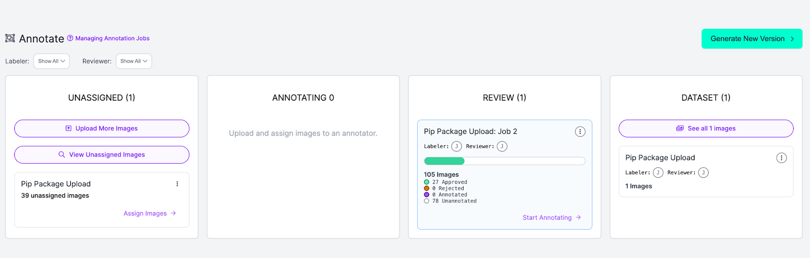 Once your images are annotated, exit the annotation tool and click "Annotate" in the sidebar. Then, click on the annotations you want to review in the Review column: