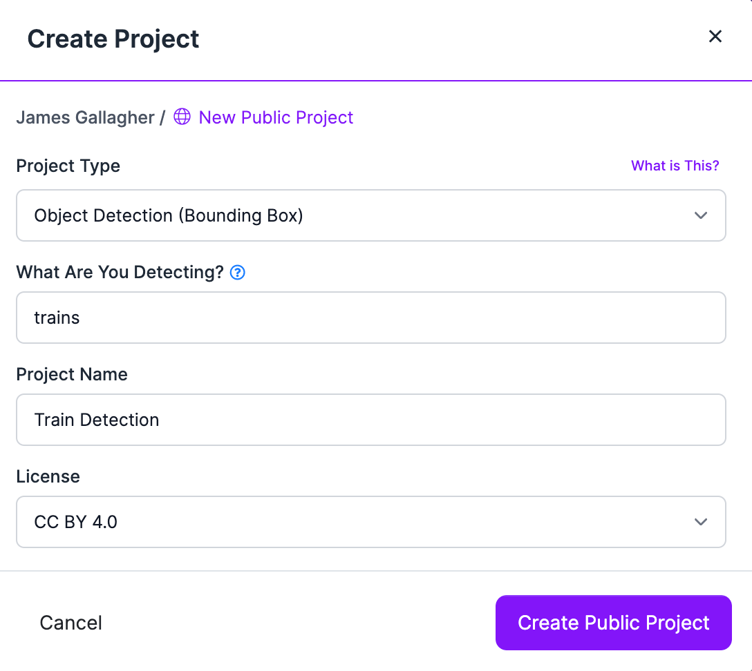 In this guide, we’re going to collect images for a train detection dataset. To get started, let’s first create a new project in Roboflow for our detection dataset. Go to the Roboflow application and click “Create Project” to create a new project. If you already have a project, you can skip this step.
