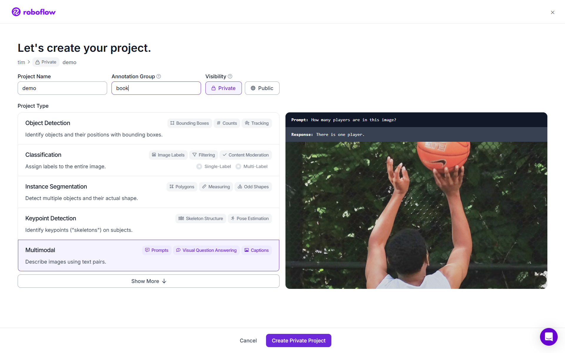 - Multimodal Project Type: Roboflow allows to create specialized project designed for multimodal annotation as well as training. This setup enables pairing images with text inputs, allowing annotation tasks that combine both visual and linguistic information. It is useful for vision–language training use cases like image captioning or Visual Question Answering (VQA).