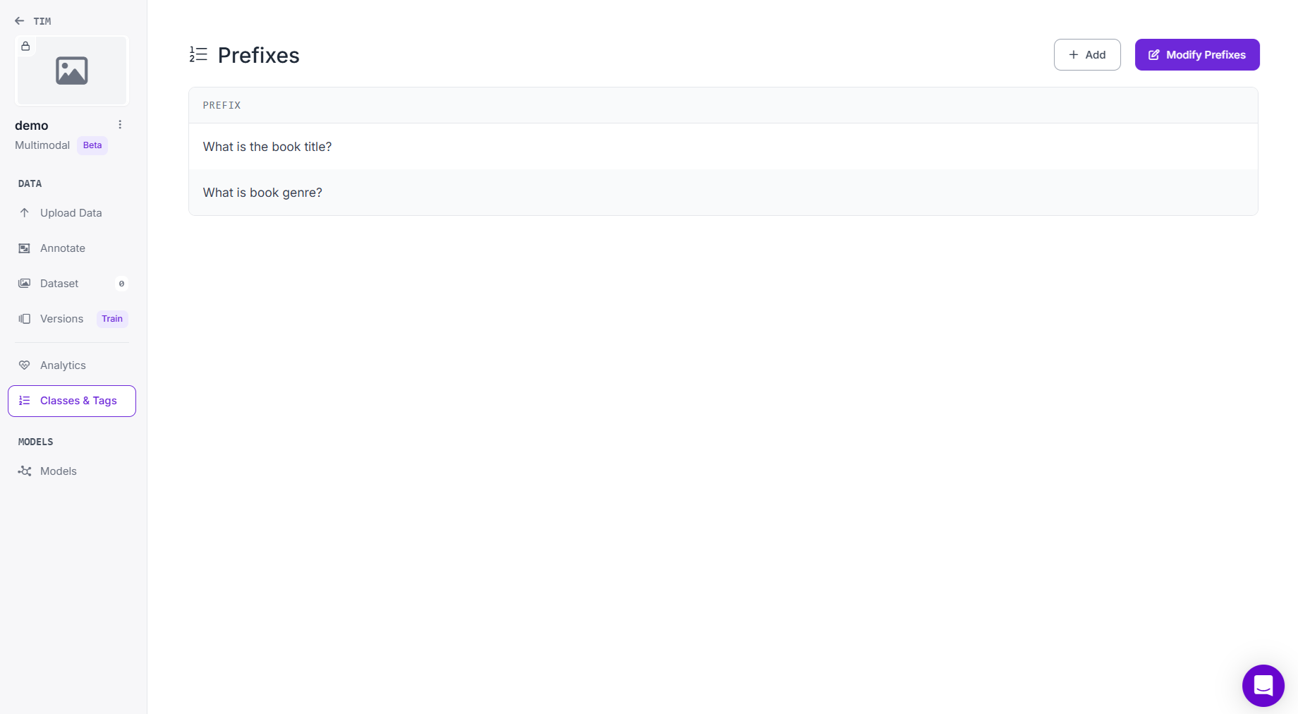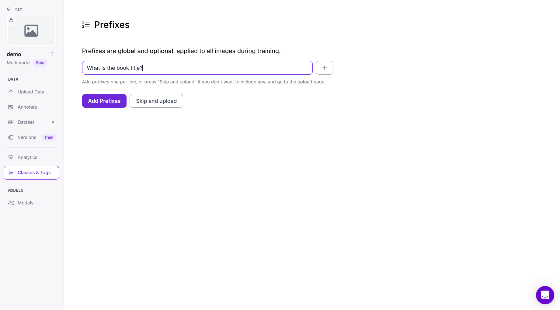 Once the project is created, Roboflow will prompt you to define prefixes. These are questions or instructions that apply to all images. Each prefix defines what the model will learn to answer from the image. A prefix can either be: