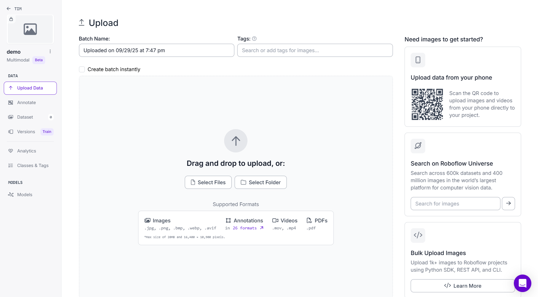 - Scan QR Code to upload directly from your smartphone using the Roboflow mobile upload app.