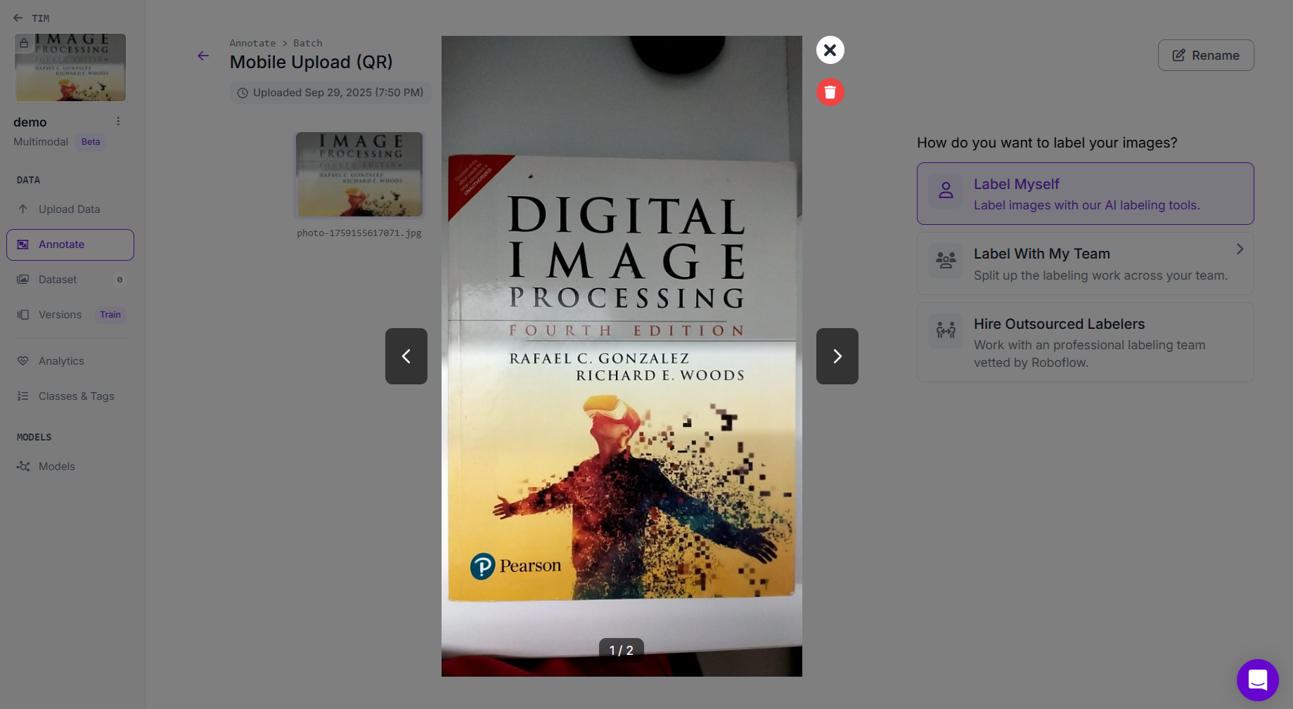 This method is useful for collecting real-world multimodal data quickly (like books, tools, or industrial components). You can upload the images on the go. Once uploaded, images appear in the batch under Upload Data.