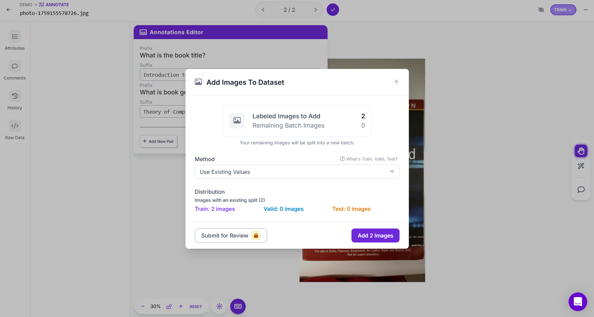 After labeling, add images to Dataset. Choose your data split (Train, Validation, Test) or keep existing splits. Click Add Image to confirm.