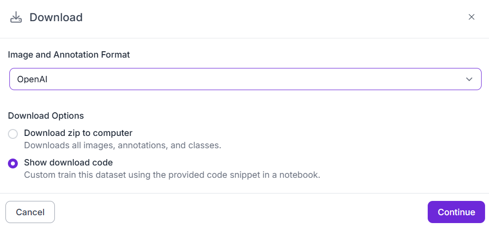 - Dataset Versioning and Export: After labeling, datasets can be versioned and exported in JSON or other structured formats that preserve both image paths and associated text data, making them ready for training modern vision–language models.