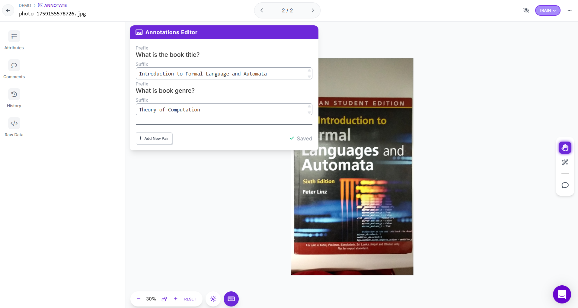 Go to Annotate from the left sidebar. Select an uploaded image to open the annotation interface. For each prefix (question or instruction), enter the corresponding text response.