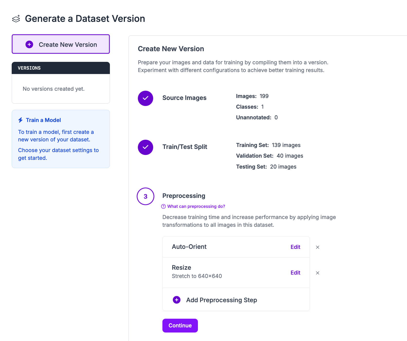 For your first model version, we recommend applying the default preprocessing steps and no augmentation steps. In future training jobs, you can experiment with different augmentations that may be appropriate for your project.