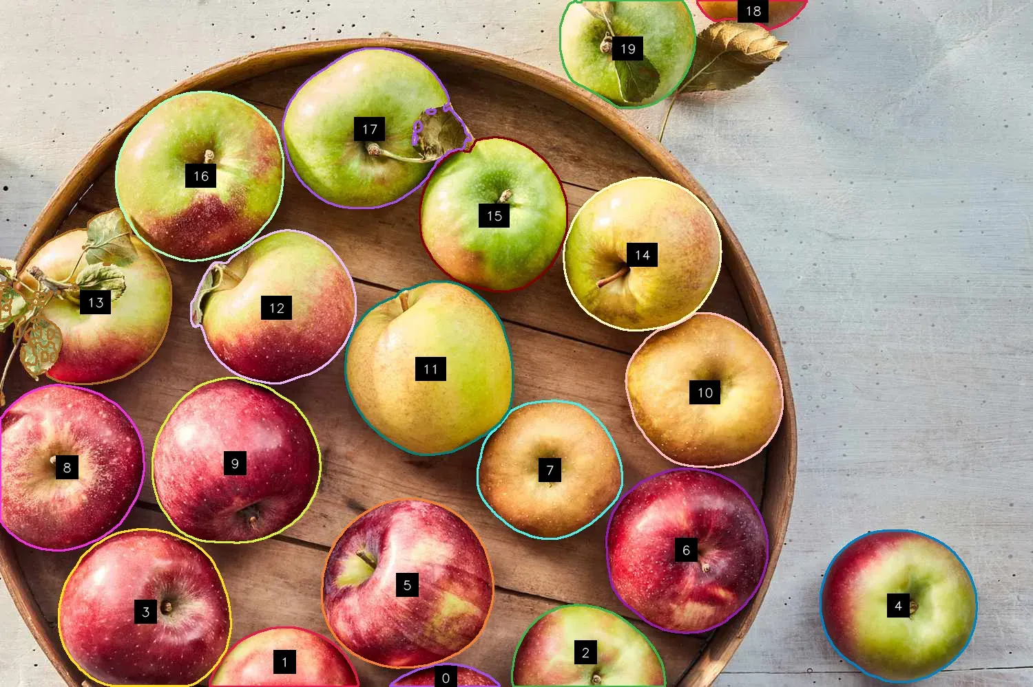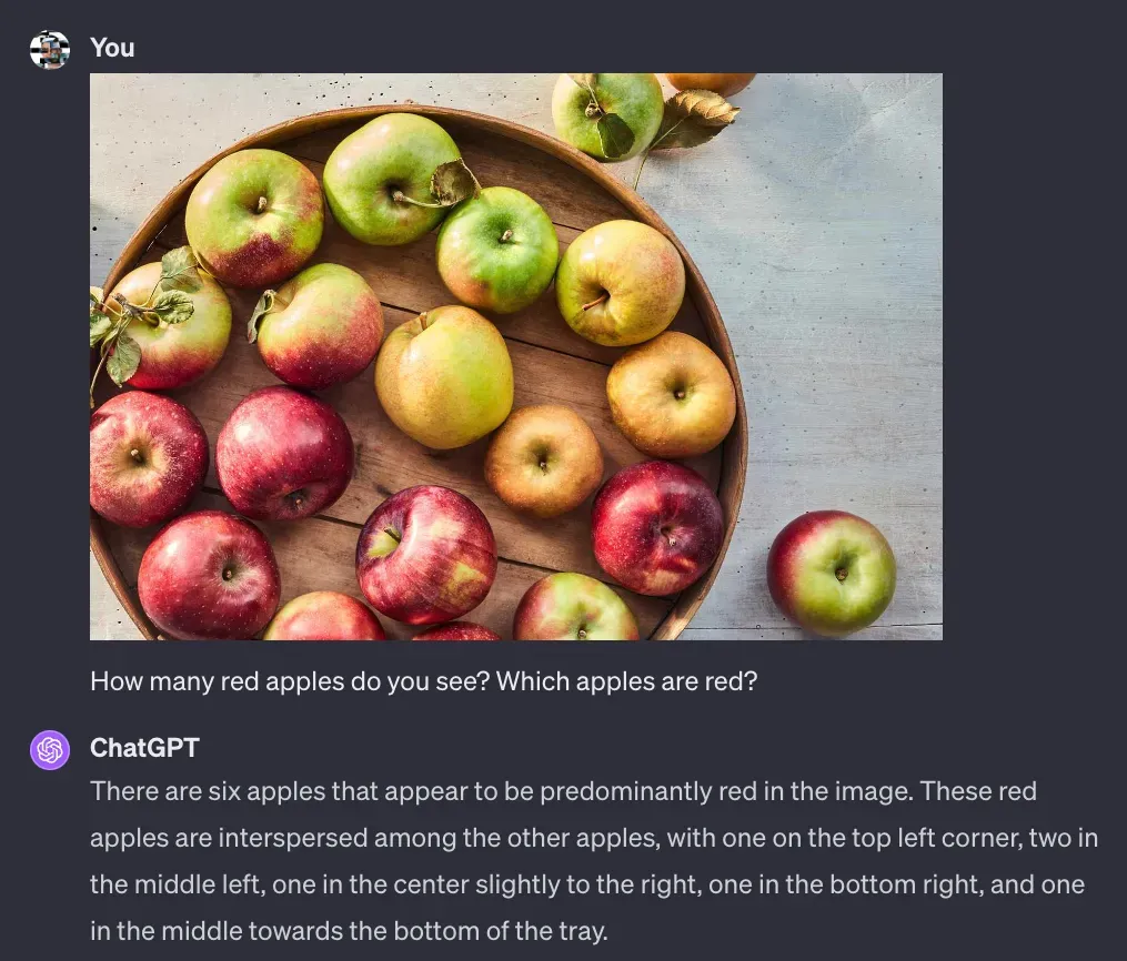 Multimodal Maestro can significantly expand GPT-4 Vision's capabilities and enable detection and/or segmentation. As an experiment, let's ask GPT-4V to detect the red apples in the photo. GPT-4V cannot return boxes or segmentation masks, so it tries to describe the position of the search objects using language.