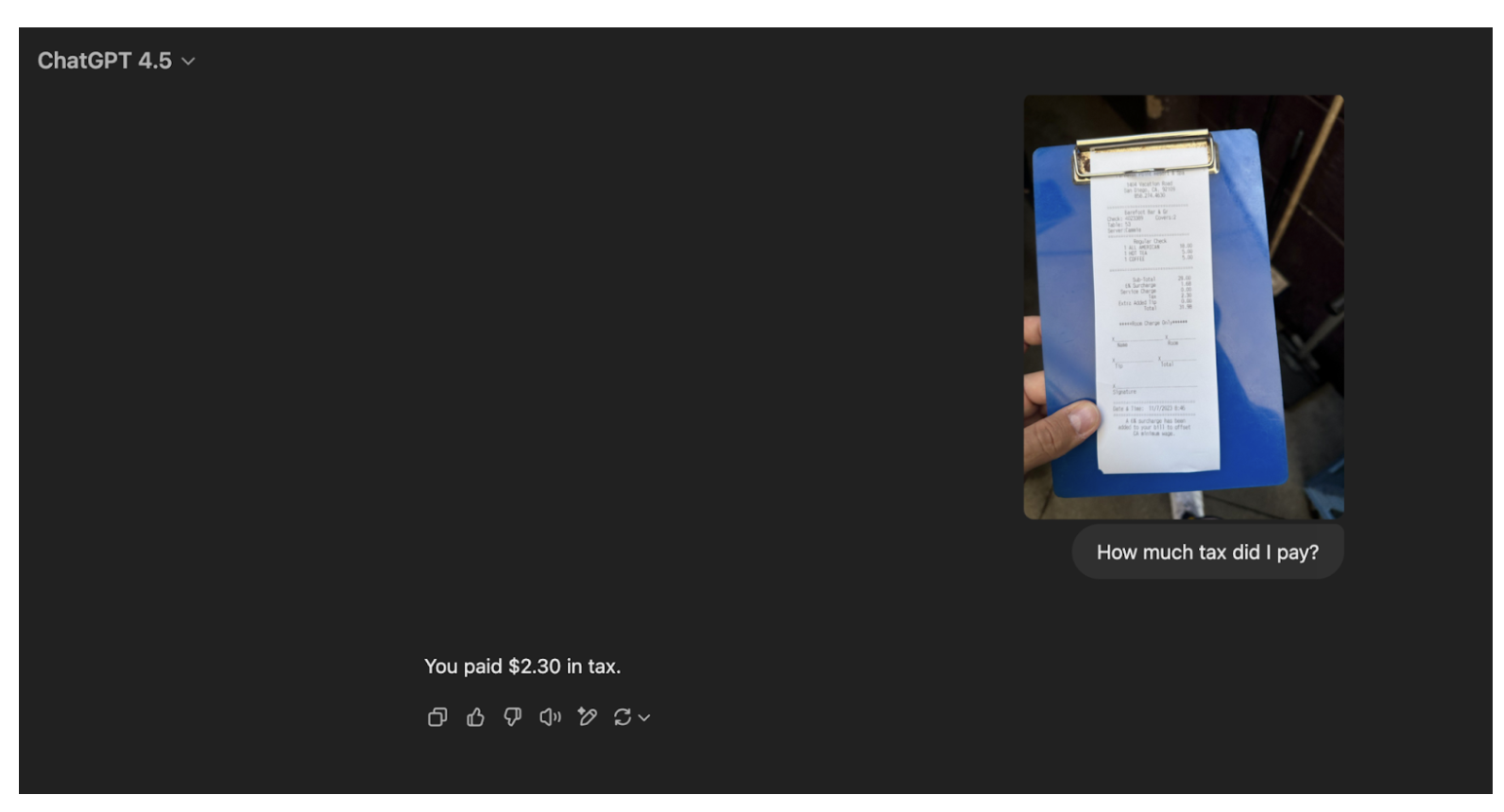 Here is an example showing GPT identify the amount of tax paid on a receipt: