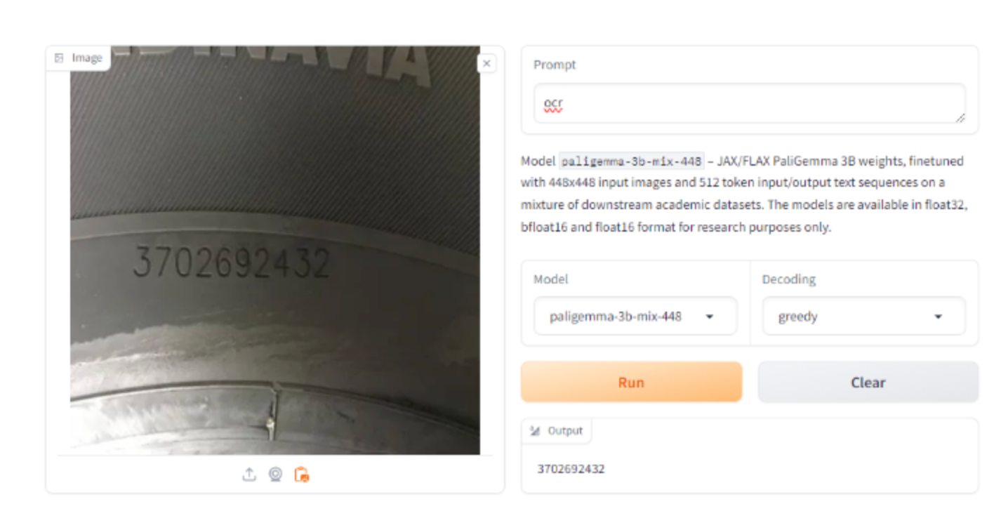 Here is an example of PaliGemma being used to read the serial number on a tire: