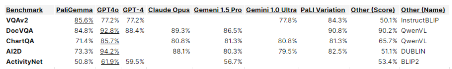 Here is how the base PaliGemma model performs when compared to other models that were state-of-the-art at the time of PaliGemma’s release: