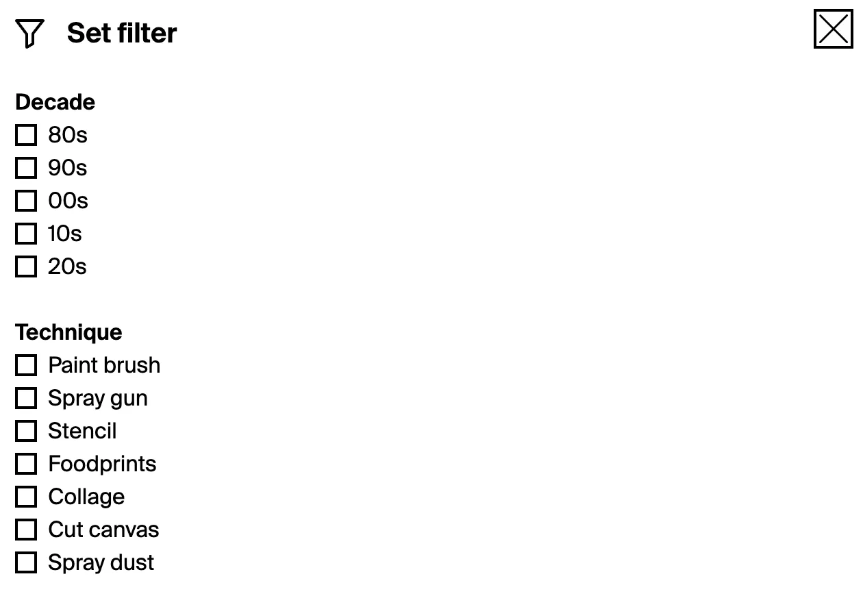 Furthermore, visitors could filter artworks by different characteristics, such as the decade in which an artwork was made and the techniques used to create the artwork: