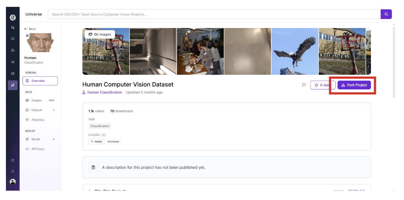 The core of this automation is a reliable computer vision model to classify whether an image contains a human. Roboflow Universe offers thousands of pre-labeled datasets and pre-trained models, saving you the effort of manual annotation. We’ll use the “Human” dataset from Roboflow Universe, ideal for binary classification tasks.