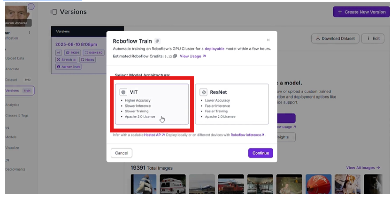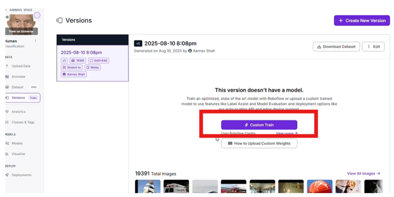 After the pre-processing finishes, select “Custom Train” to use Roboflow’s cloud-based GPUs for efficient training.