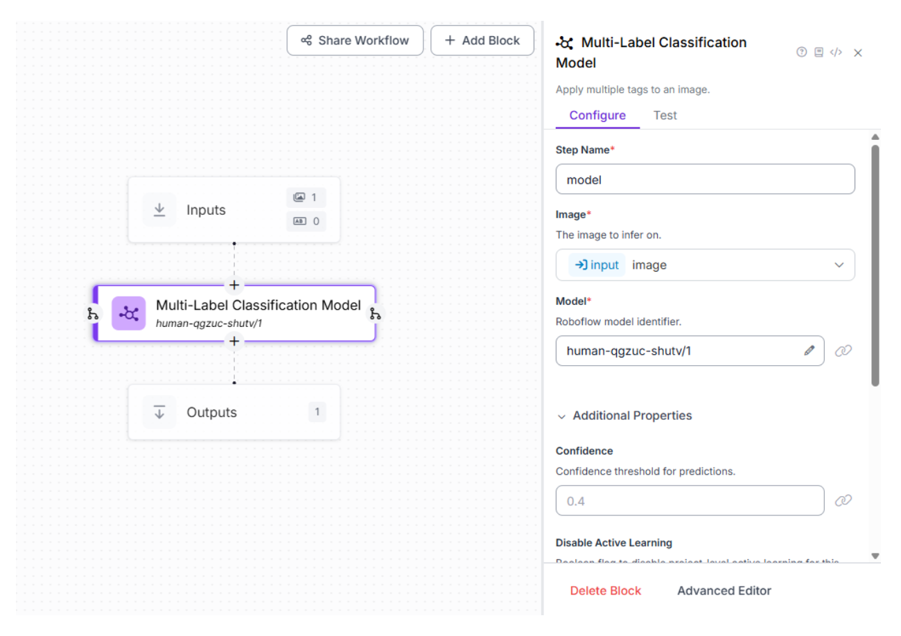 To integrate the model with n8n, we’ll create a simple Roboflow workflow to expose the model via an API endpoint.