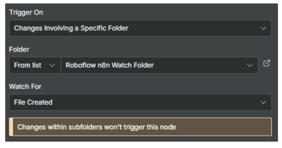 - Folder: Select “Roboflow n8n Watch Folder” via list or ID.