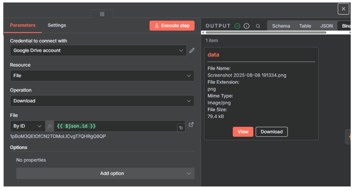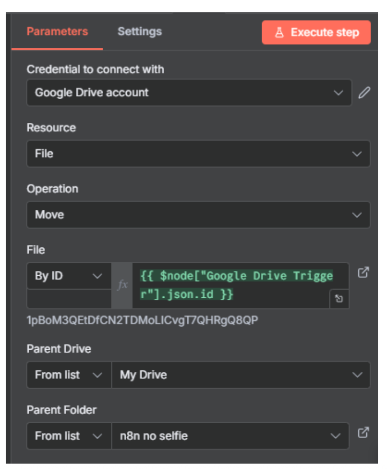 - File ID: {{ $json.id }} (fetches the file ID from the trigger node).