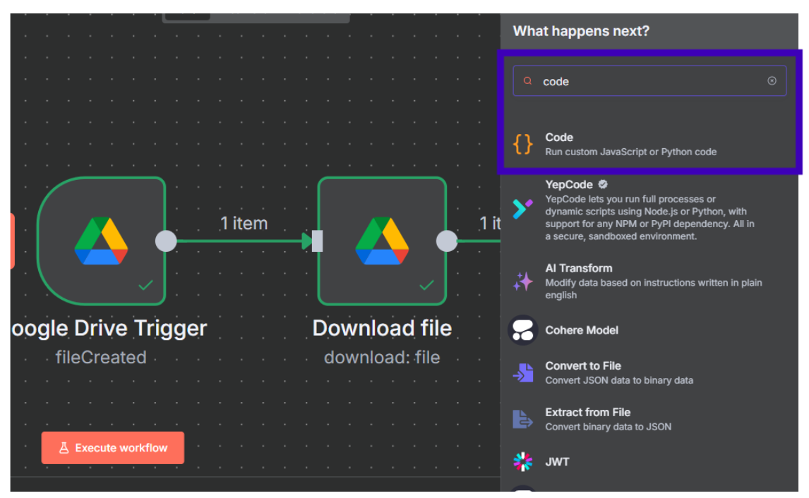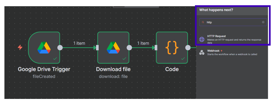 Let’s construct the n8n workflow, starting with the trigger and file download.