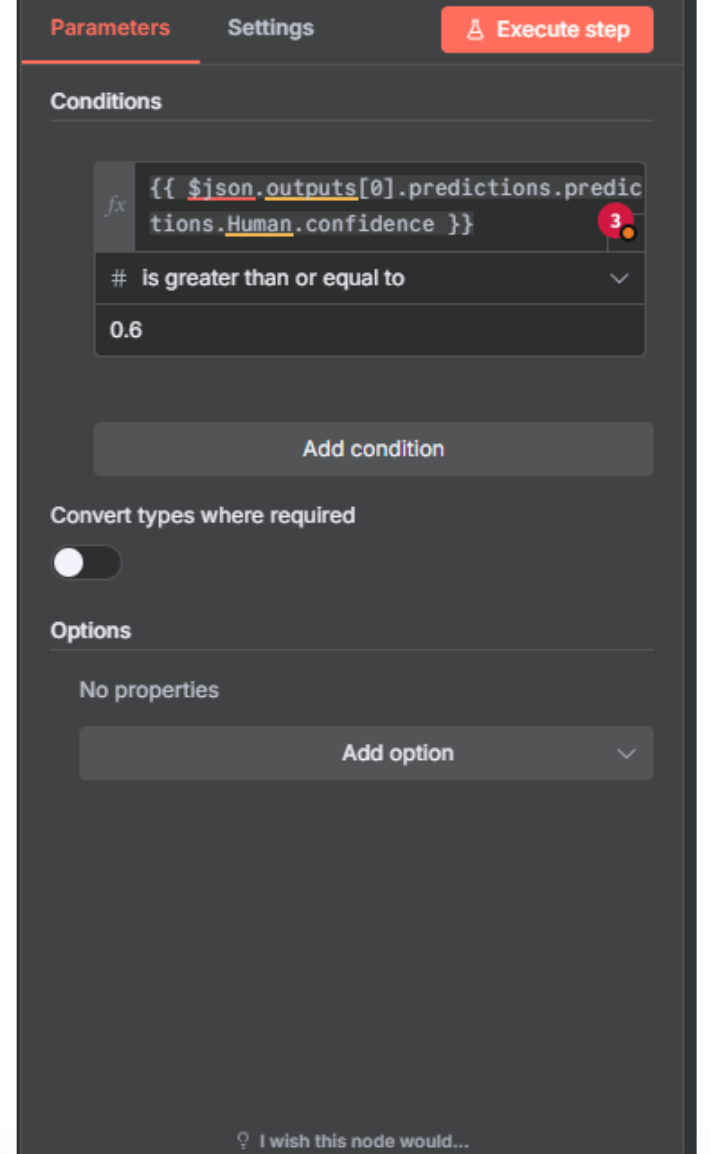- Condition: Use Expression mode: {{ $json.outputs[0].predictions.predictions.Human.confidence }}.