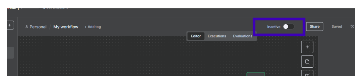 - Toggle the “Activate” slider in n8n (top-left near the Share button).
