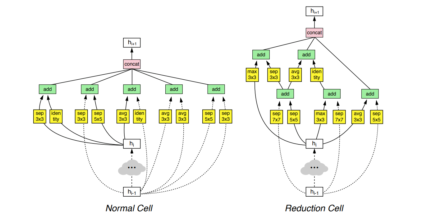 - Reduction cell halves the spatial resolution by using stride-2 operations.