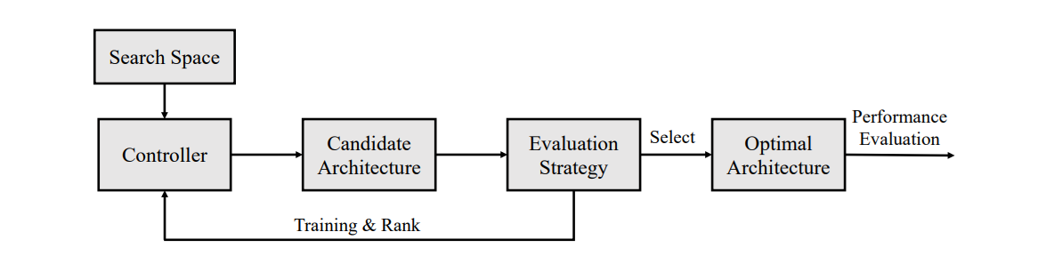 A controller (the search strategy) proposes architectures from the search space. The controller might randomly sample, follow a policy learned by reinforcement learning, mutate existing architectures in an evolutionary loop, or adjust architecture parameters using gradients.