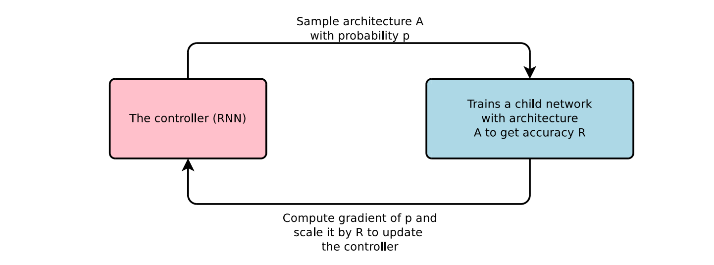 In the reinforcement learning based NAS search technique, an agent (often implemented as a RNN controller) generates architectures step-by-step by making sequential decisions about layers, operations, and connections. After an architecture is generated, it is trained and evaluated on a target task, and the resulting performance (e.g., validation accuracy) is used as a reward signal. Over many iterations, the controller learns to produce better architectures by maximizing these rewards. This approach treats architecture search as a sequential decision-making problem, allowing the system to explore vast and complex design spaces.