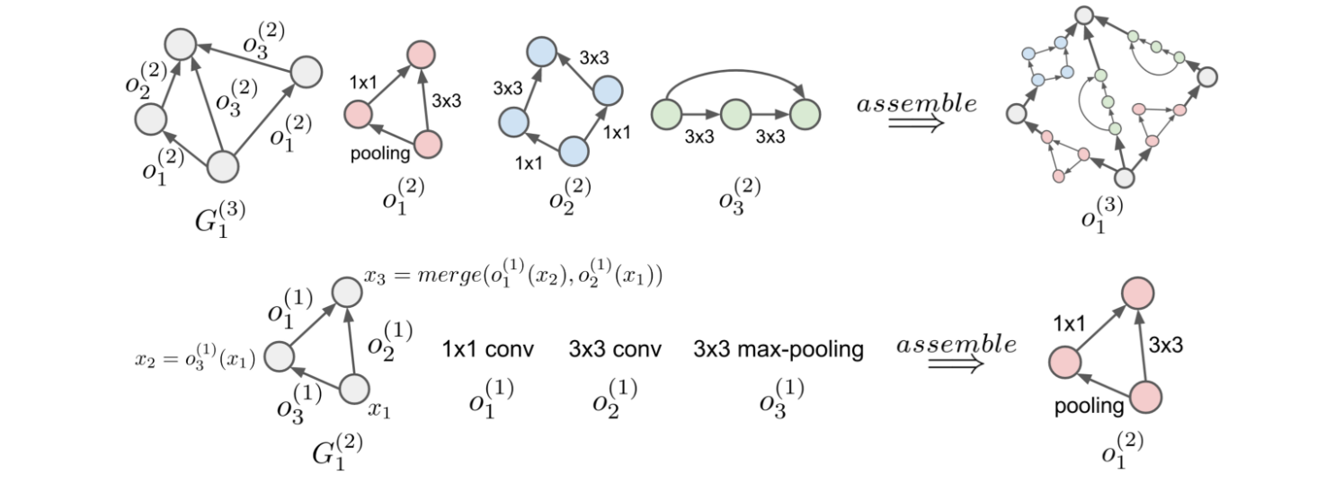 - Level 2 defines motifs, a small structures made by combining multiple primitives into a reusable unit. For example, a ResNet residual block combining convolution, batch normalization, and skip connections.