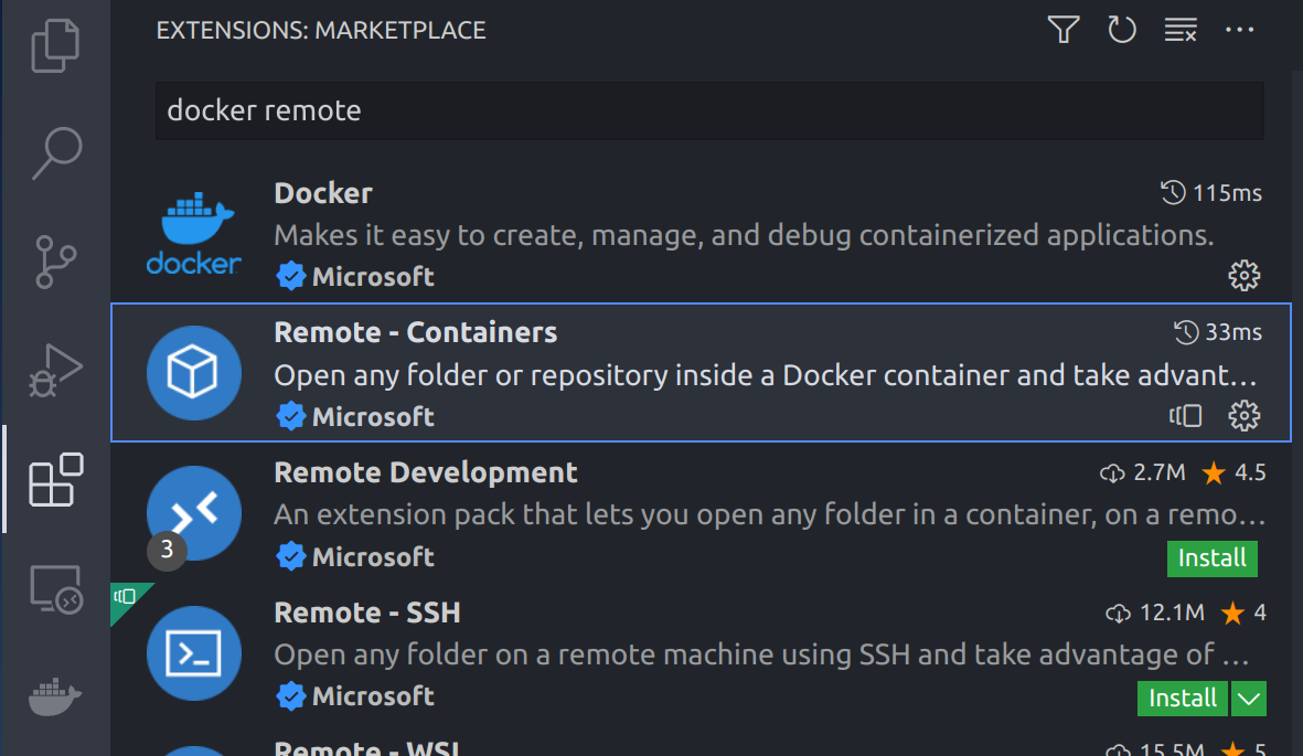 Next, you need to install the remote container extension. It allows us to run VS Code from inside any container.