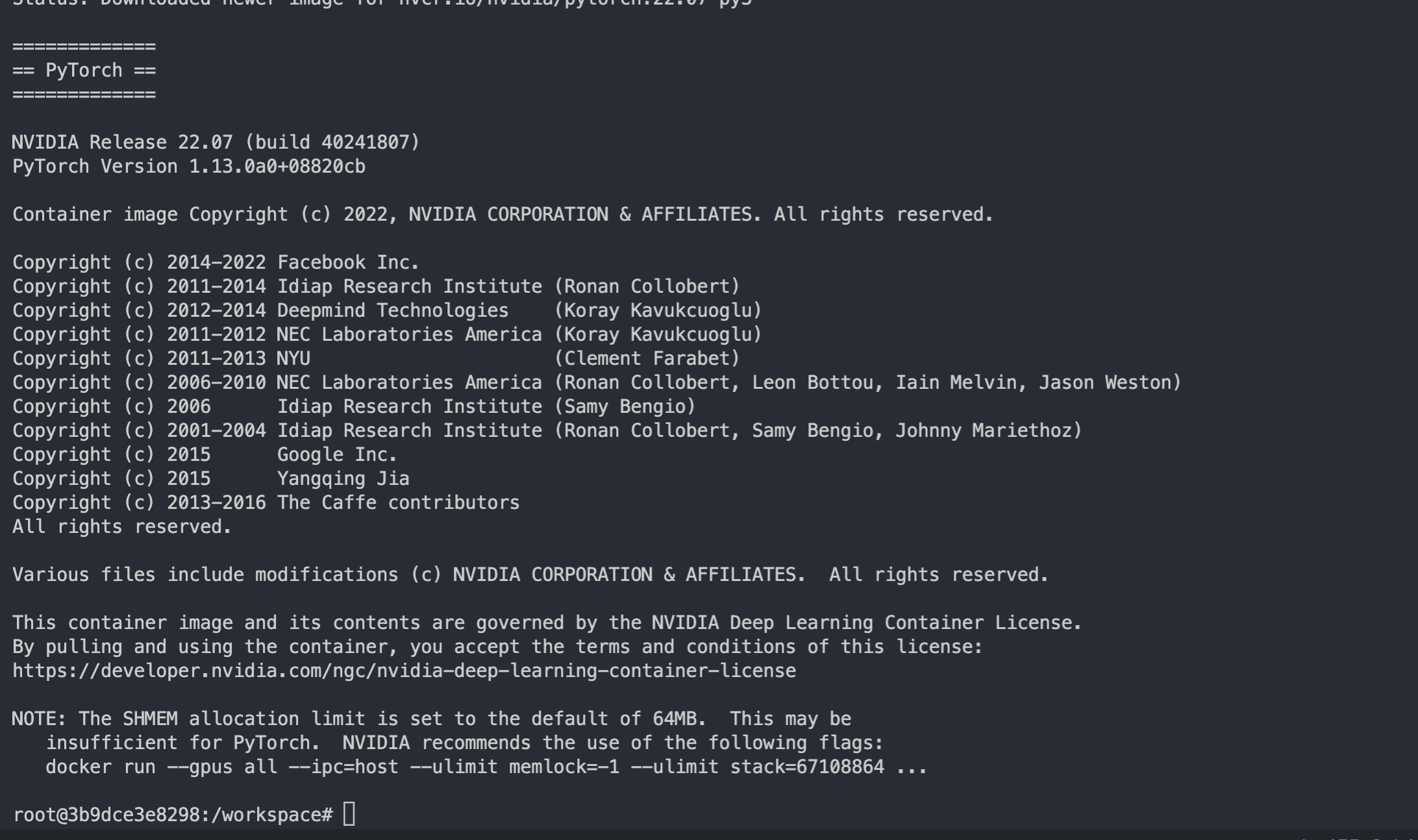 docker run --gpus all --ipc=host --ulimit memlock=-1 --ulimit stack=67108864 -it --rm nvcr.io/nvidia/pytorch:22.07-py3