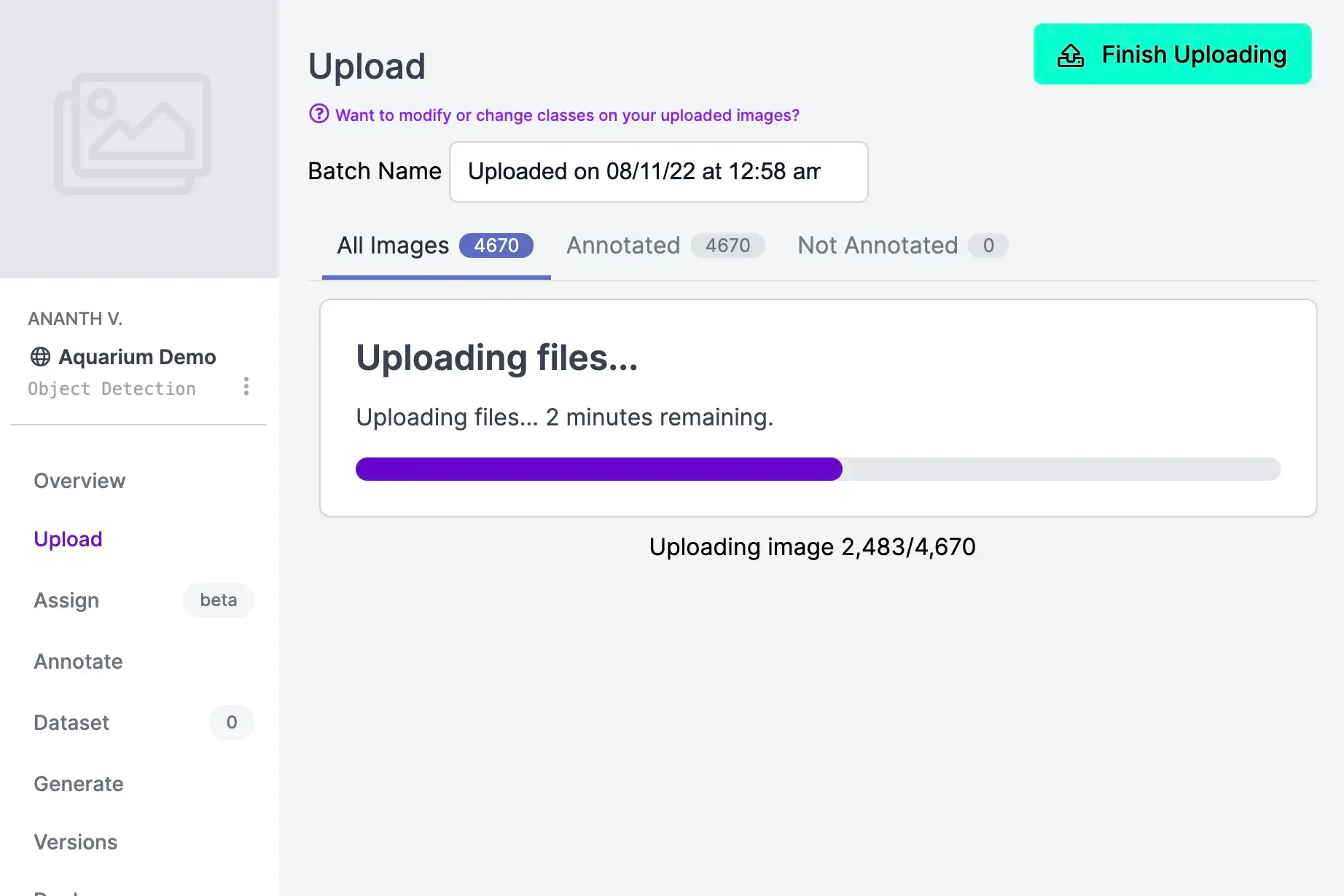 Under the Annotate tab, you'll see which pieces of data still need to be annotated. Annotation refers to labelling each object that you want to be detected in the training data. Keep in mind that this is what the model learns from – accurate annotations will help train a more accurate model.
