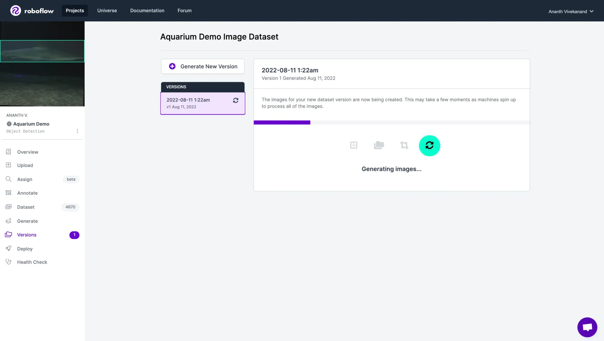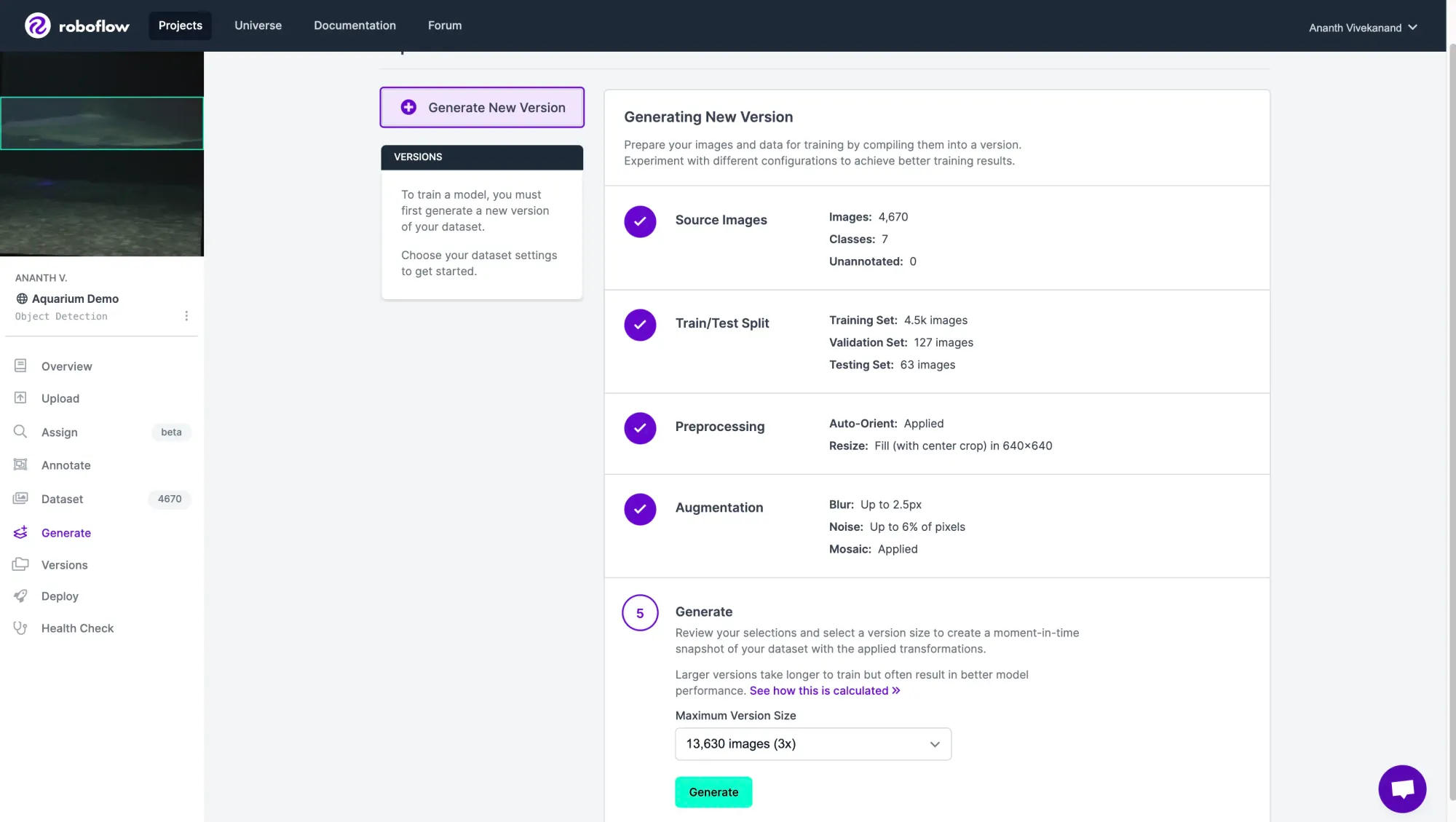 Under the Generate tab, you can generate a dataset from your annotated data. Here, you can choose to apply preprocessing and augmentations to your dataset.