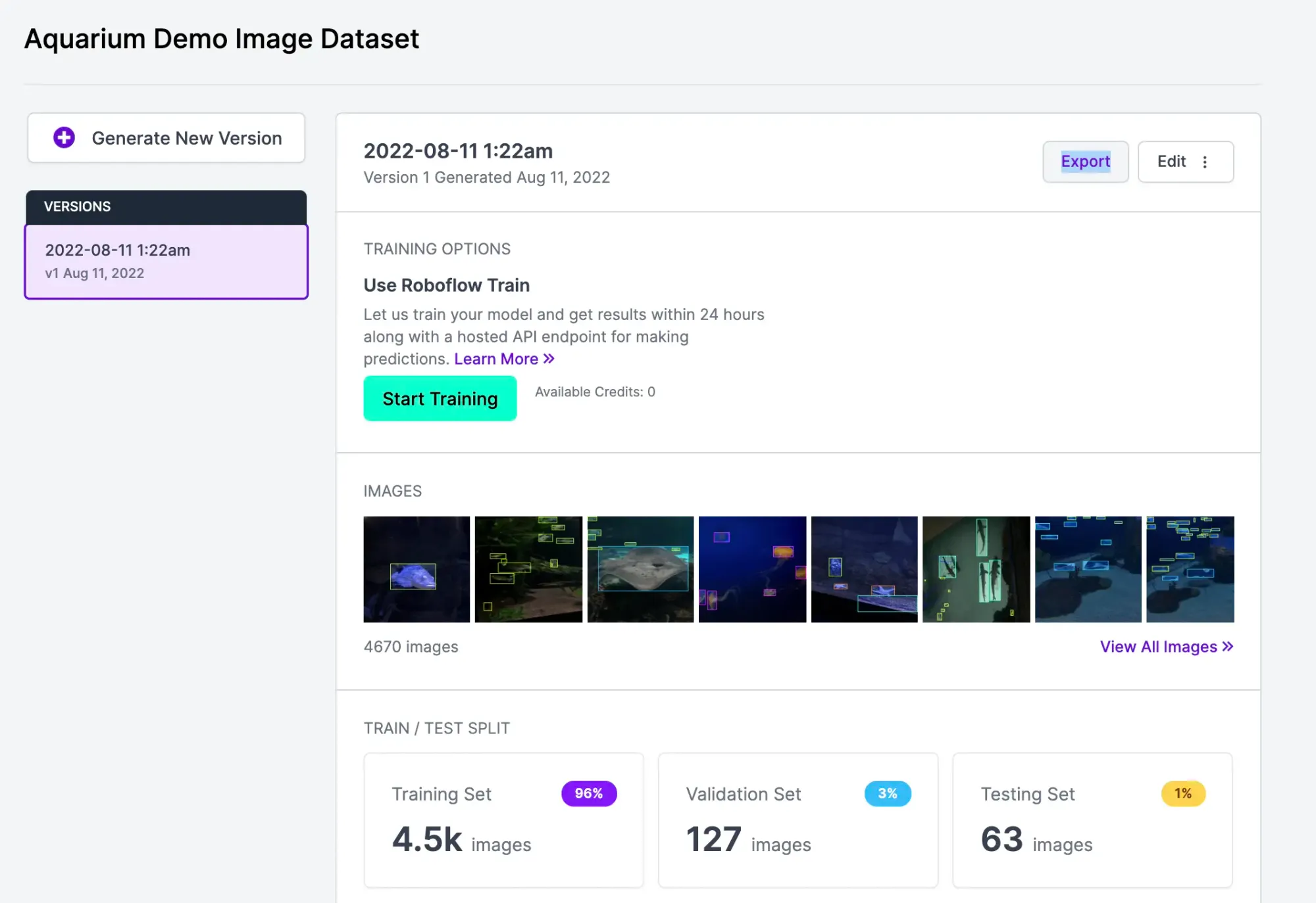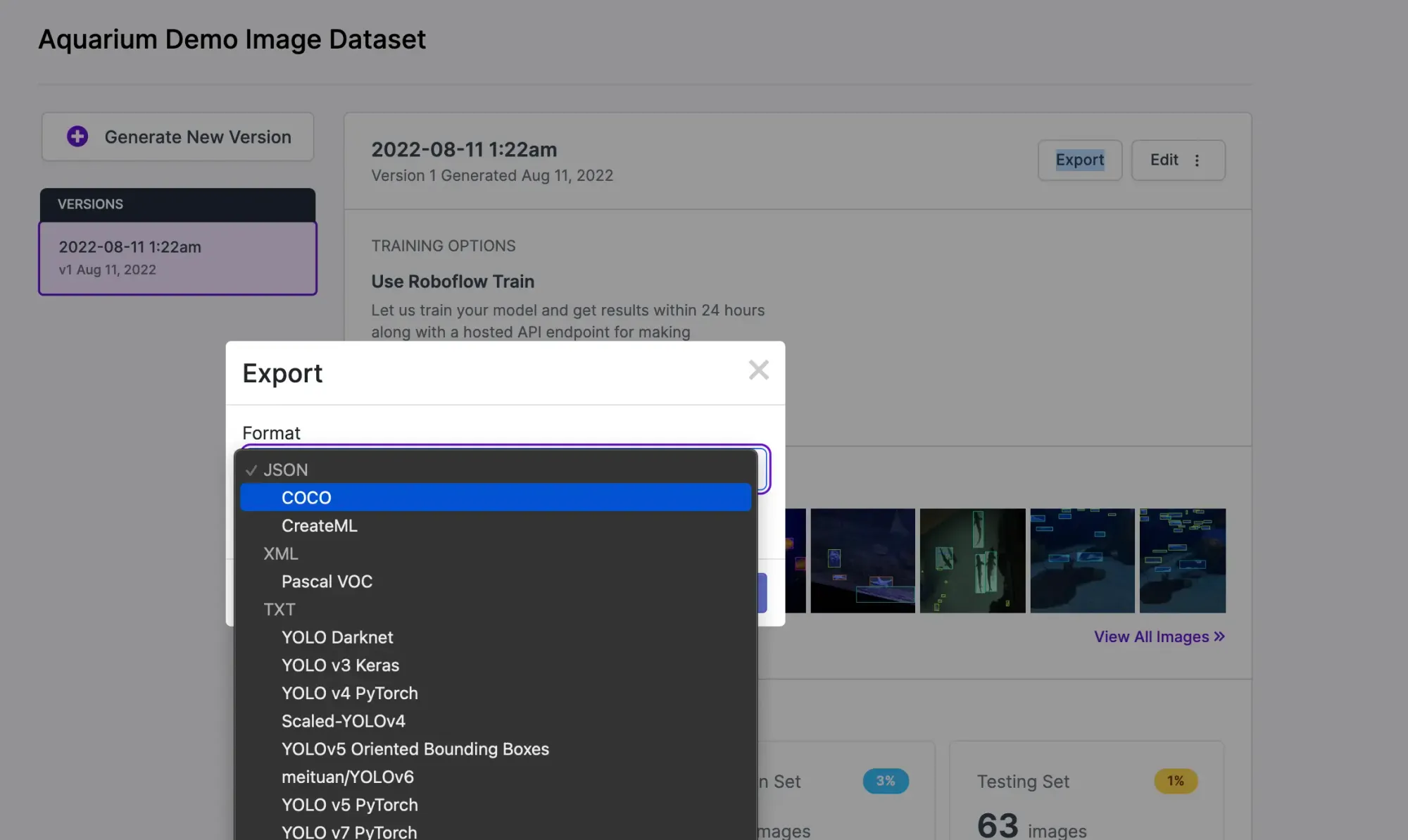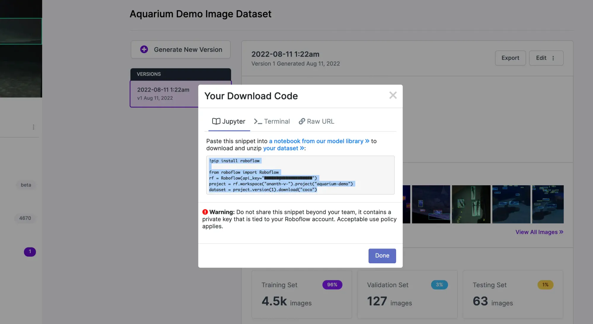 Under Versions, click Export. For the NVIDIA TAO Toolkit, we'll choose to export in the COCO format. Click "Show Download Code", copy over the snippet into the corresponding Jupyter Notebook cell, and run it to download the dataset.